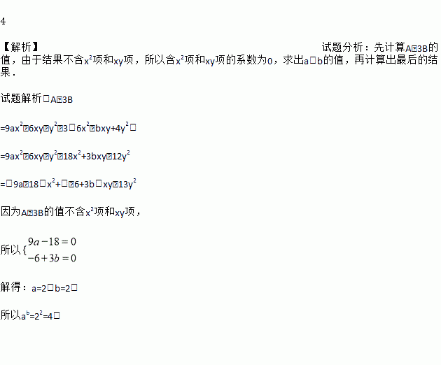 4 【解析】试题分析:先计算A﹣3B的值,由于结果不含x2项和xy项,所以含x2项和xy项的系数为0,求出a、b的值,再计算出最后的结果. 试题解析:A﹣3B =9ax2﹣6xy﹣y2﹣3(6x2﹣bxy+4y2) =9ax2﹣6xy﹣y2﹣18x2+3bxy﹣12y2 =(9a﹣18)x2+(﹣6+3b)xy﹣13y2 因为A﹣3B的值不含x2项和xy项, ...