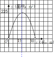 分析:(1)由图知B场地宽为(30-x),所以面积y=x(30-x);函数与x轴的交点坐标y=0,解方程求横坐标;根据图形知0<x<30.