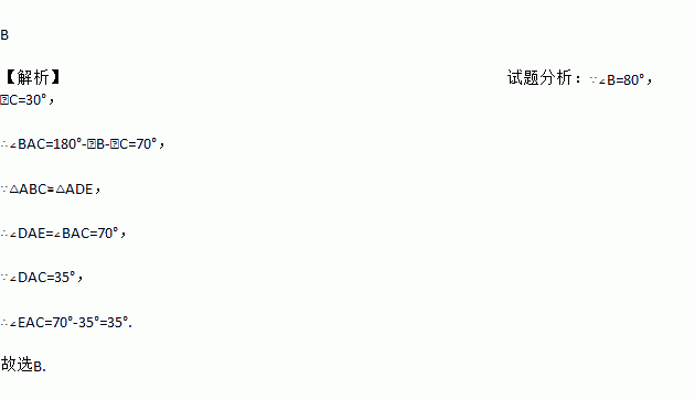 B 【解析】试题分析:∵∠B=80°,∠C=30°, ∴∠BAC=180°-∠B-∠C=70°, ∵△ABC≌△ADE, ∴∠DAE=∠BAC=70°, ∵∠DAC=35°, ∴∠EAC=70°-35°=35°. 故选B.