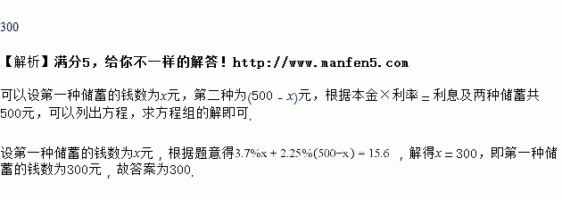 小悦以两种方式共储蓄了500元,假设第一种方式的年利率为3.7%,第二种方式的年利率为2.25%,一年后共得到利息为15.6元(不考虑利息税),那么小悦以第一种方式储蓄的钱数是_____________元.