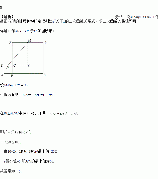 如图,线段AB=10,点P在线段AB上,在AB的同侧分别以AP、BP为边长作正方形APCD和BPEF,点M、N分别是EF、CD的中点,则MN的最小值是_____.