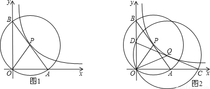 如图1,在平面直角坐标系中,O为坐标原点,P是反比例函数y=(x>0)图象上任意一点,以P为圆心,PO为半径的圆与坐标轴分别交于点A、B.