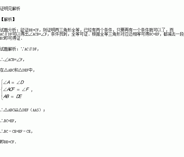 如图,已知点B、E、C、F在同一条直线上,AB=DE,∠A=∠D,AC∥DF.求证:BE=CF.