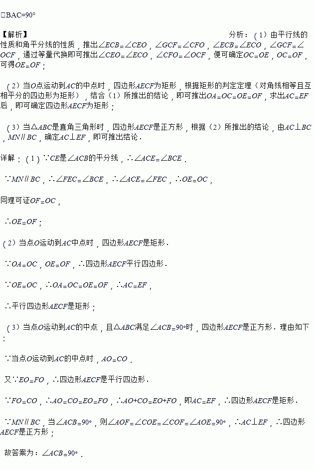 已知△ABC中,点O是边AC上的一个动点,过O作直线MN∥BC,设MN交∠BCA的平分线于点E,交∠BCA的外角平分线于点F.