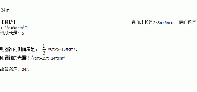 一个圆锥的底面半径为3cm,高为4cm,则这个圆锥的全面积为________cm2.