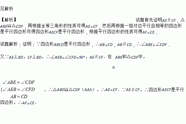 如图,在□ABCD中,AE⊥BD于E,CF⊥BD于F,连接AF,CE.求证:AF=CE.