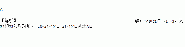 A 【解析】【解析】 ∵AB∥CD,∴∠1=∠3,又∠2和∠3为对顶角,∴∠3=∠2=40°,∴∠1=40°.故选A.