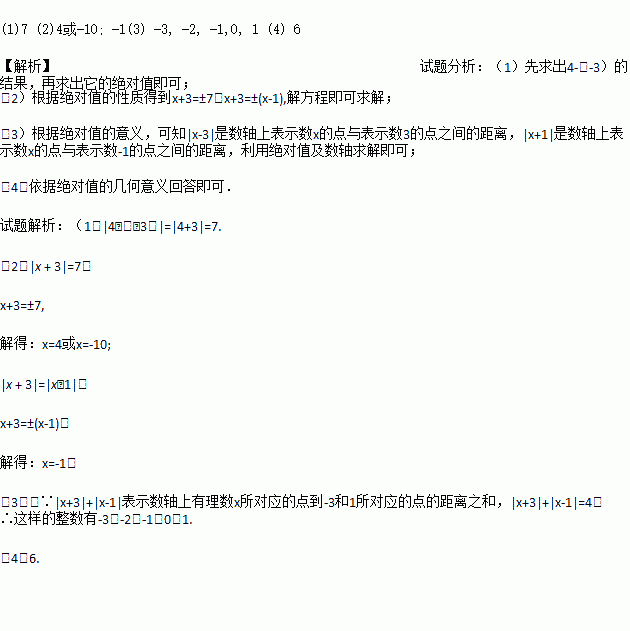 (3)| x + 3|+|x﹣1|表示数轴上有理数x所对的点到﹣3和1所对的两点距离之和.请你利用数轴,找出所有符合条件的整数x,使得| x + 3|+|x﹣1|=4.