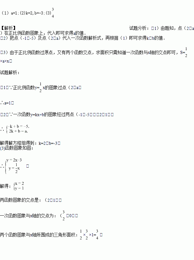 已知一次函数y=kx+b的图象经过点(-1,-5),且与正比例函数y=x的图象相交于点(2,a),求: