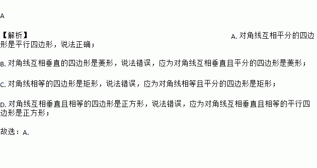 A 【解析】A. 对角线互相平分的四边形是平行四边形,说法正确; B. 对角线互相垂直的四边形是菱形,说法错误,应为对角线互相垂直且平分的四边形是菱形; C. 对角线相等的四边形是矩形,说法错误,应为对角线相等且平分的四边形是矩形; D. 对角线互相垂直且相等的四边形是正方形,说法错误,应为对角线互相垂直且相等的平行四边形是正方形; 故选:A.