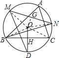 分析:连接OB,OC,由D为弧BC的中点,利用垂径定理得到H为BC的中点,在直角三角形BOH中,由OH为OB的一半,得到∠OBC的度数为30°,由OB=OC,利用等边对等角得到∠OCB也为30°,进而求出∠BOC的度数,利用同弧所对的圆周角等于所对圆心角的一半求出∠A的度数,即可做出判断;∠M对弧DN,及弧DC+弧CN,∠N对弧BM,而弧DC+弧CN+弧BM为圆周的一半,可得出两角之和为直角,进而确定出MD⊥BN;过O作OG垂直于MN,利用垂径定理得到G为MN的中点,由∠BOC的度数求出∠MOB+∠MON+∠NOC的度数,再由弧BM=弧AM,弧AN=弧CN,得到∠MON为三角之和的一半,求出∠MON为120°,可得出∠OMG=∠OBH=30°,再由一对直角相等及半径相等,利用AAS得到三角形OMG与三角形OBH全等,利用全等三角形的对应边相等得到MG=BH,即可得到MN=BC.