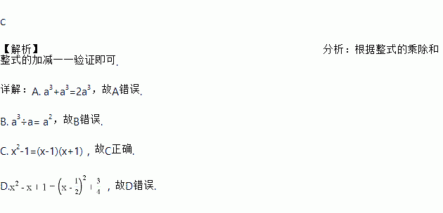 A. a3+a3=a6 B. a3÷a=3 C. x2-1=(x-1)(x+1) D.
