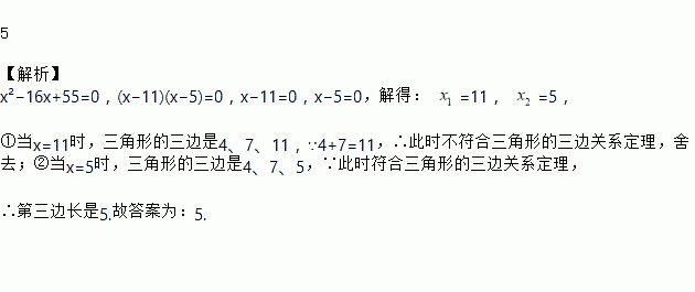已知三角形的两边长分别是4和7,第三边是方程x2﹣16x+55=0的根,则第三边长是______.
