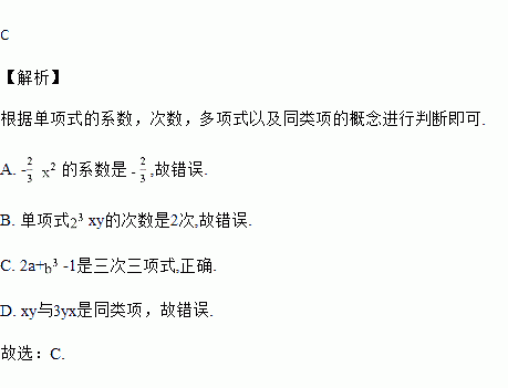 A. - 的系数是 B. 单项式xy的次数是5 次 C. 2a+-1是三次三项式 D. xy与3yx不是同类项