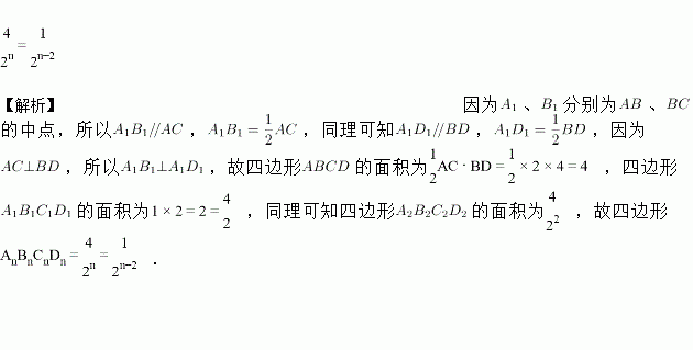 如图,四边形ABCD中,对角线AC⊥BD,且AC=2,BD=4,各边中点分别为A1、B1、C1、D1,顺次连接得到四边形A1B1C1D1,再取各边中点A2、B2、C2、D2,顺次连接得到四边形A2B2C2D2,…,依此类推,这样得到四边形AnBnCnDn,则四边形AnBnCnDn的面积为_______.