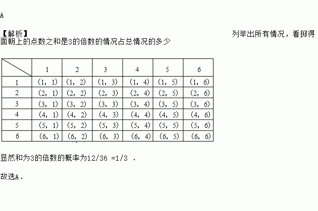 小明同时向上掷两枚质地均匀、同样大小的正方体骰子,骰子的六个面上分别刻有1到6的点数,掷得面朝上的点数之和是3的倍数的概率是( )
