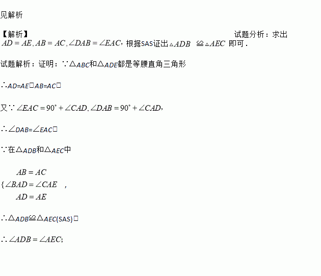 如图,△ABC和△ADE都是等腰三角形,且∠BAC=90°,∠DAE=90°,点B、C、D在同一条直线上;试说明:∠ADB=∠AEC;