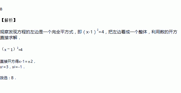 用直接开方法解方程(x﹣1)2=4,得到方程的根为( )