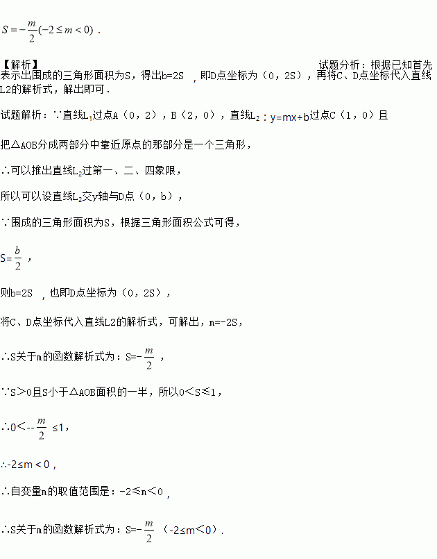 如图,直线L1过A(0,2),B(2,0)两点,直线L2:y=mx+b过点C(1,0),且把△AOB分成两部分,其中靠近原点的那部分是一个三角形,设此三角形的面积为S,求S关于m的函数解析式,及自变量m的取值范围.