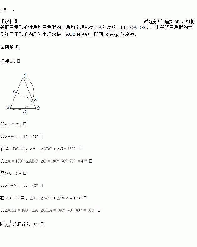 如图,在中,,,以为直径的半圆与、分别相交于点、,求弧的度数.