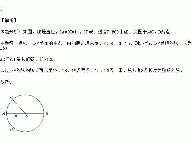 已知⊙O的半径为10,P为⊙O内一点,且OP=6,则过P点,且长度为整数的弦有( )