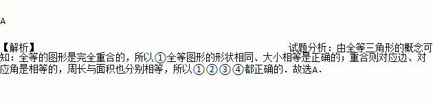 下列说法:①全等图形的形状相同、大小相等;②全等三角形的对应边相等;③全等三角形的对应角相等;④全等三角形的周长、面积分别相等,其中正确的说法为( )