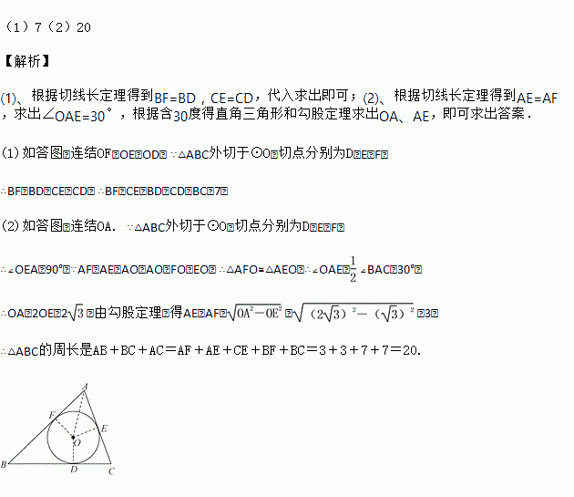 如图,△ABC外切于⊙O,切点分别为点D,E,F,∠A=60°,BC=7,⊙O的半径为