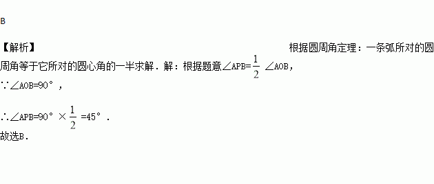 如图,四个边长为1的小正方形拼成一个大正方形,A、B、O是小正方形顶点,⊙O的半径为1,P是⊙O上的点,且位于右上方的小正方形内,则∠APB等于( ).