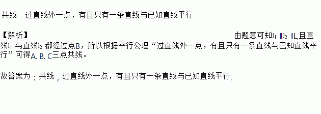 共线 过直线外一点,有且只有一条直线与已知直线平行 【解析】由题意可知∥∥L,且直线与直线都经过点B,所以根据平行公理“过直线外一点,有且只有一条直线与已知直线平行”可得A. B. C三点共线。 故答案为:共线,过直线外一点,有且只有一条直线与已知直线平行.