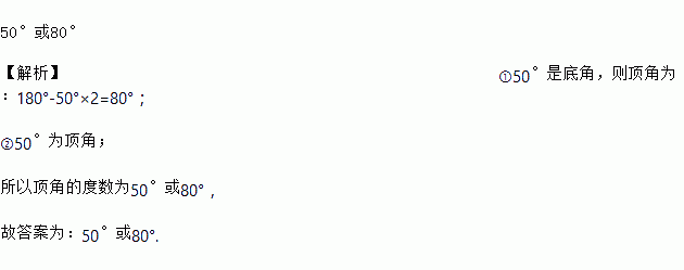 50°或80° 【解析】①50°是底角,则顶角为:180°-50°×2=80°; ②50°为顶角; 所以顶角的度数为50°或80°, 故答案为:50°或80°.