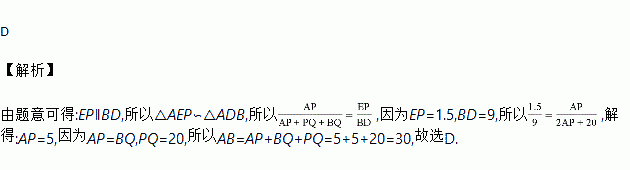 如图,丁轩同学在晚上由路灯AC走向路灯BD,当他走到点P时,发现身后他影子的顶部刚好接触到路灯AC的底部,当他向前再步行20 m到达Q点时,发现身前他影子的顶部刚好接触到路灯BD的底部,已知丁轩同学的身高是1.5 m,两个路灯的高度都是9 m,则两路灯之间的距离是( )
