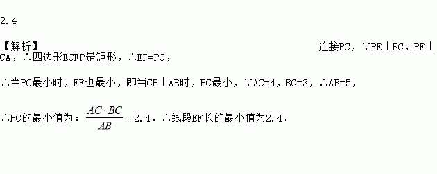 如图,△ABC是以AB为斜边的直角三角形,AC=4,BC=3,P为AB上一动点,且PE⊥AC于E,PF⊥BC于F,则线段EF长度的最小值是 。
