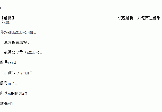 C 【解析】试题解析:方程两边都乘(x﹣1), 得7x+5(x﹣1)=2m﹣1, ∵原方程有增根, ∴最简公分母(x﹣1)=0, 解得x=1, 当x=1时,7=2m﹣1, 解得m=4, 所以m的值为4. 故选C.