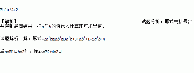 ﹣a2b+4; 2 【解析】试题分析:原式去括号合并得到最简结果,把a与b的值代入计算即可求出值. 试题解析:【解析】 原式=2a2b﹣ab2﹣3a2b+3+ab2+1=﹣a2b+4 当a=﹣1,b=2时,原式=﹣2+4=2.