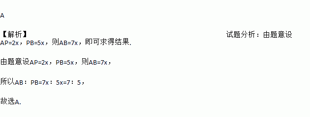 A 【解析】试题分析:由题意设AP=2x,PB=5x,则AB=7x,即可求得结果. 由题意设AP=2x,PB=5x,则AB=7x, 所以AB:PB=7x:5x=7:5, 故选A.