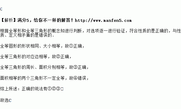 下列说法:①全等图形的形状相同、大小相等;②全等三角形的对应边相等;③全等三角形的周长、面积分别相等;④面积相等的两个三角形全等,其中正确的说法为( )