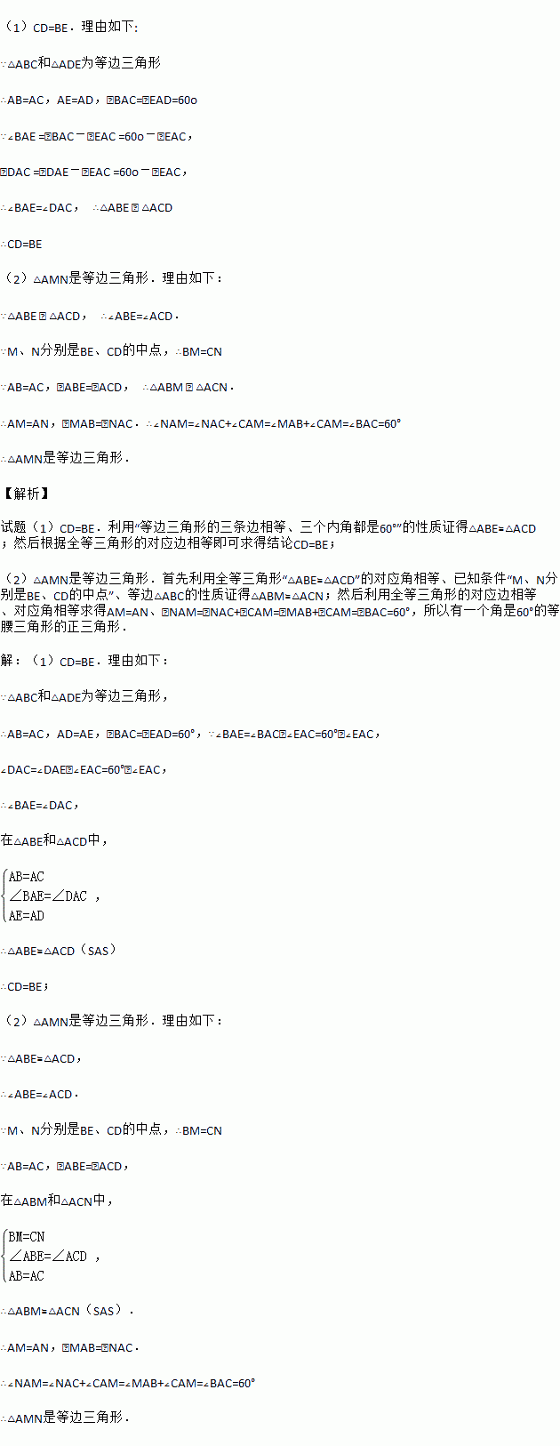 如图,若△ABC和△ADE为等边三角形,M,N分别EB,CD的中点,易证:CD=BE,△AMN是等边三角形.