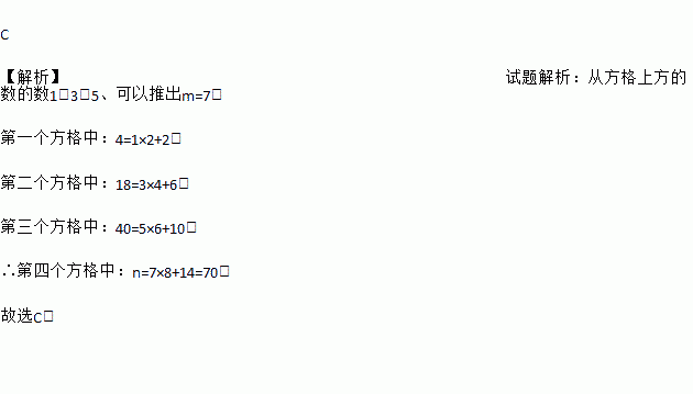 C 【解析】试题解析:从方格上方的数的数1、3、5、可以推出m=7, 第一个方格中:4=1×2+2, 第二个方格中:18=3×4+6, 第三个方格中:40=5×6+10, ∴第四个方格中:n=7×8+14=70. 故选C.