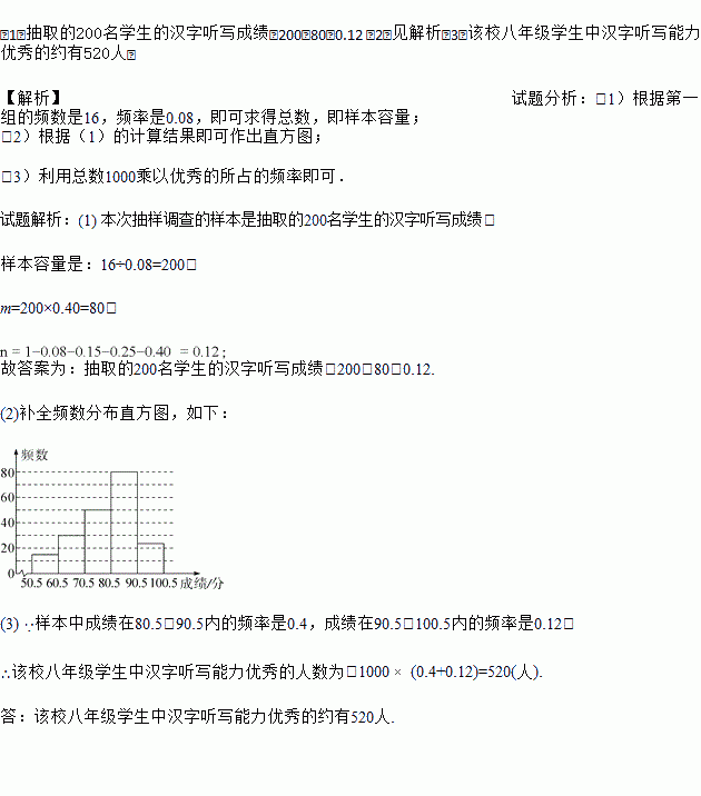 (3)若抽取的样本具有较好的代表性,且成绩超过80分为优秀,根据样本估计该校八年级学生中汉字听写能力优秀的约有多少人?