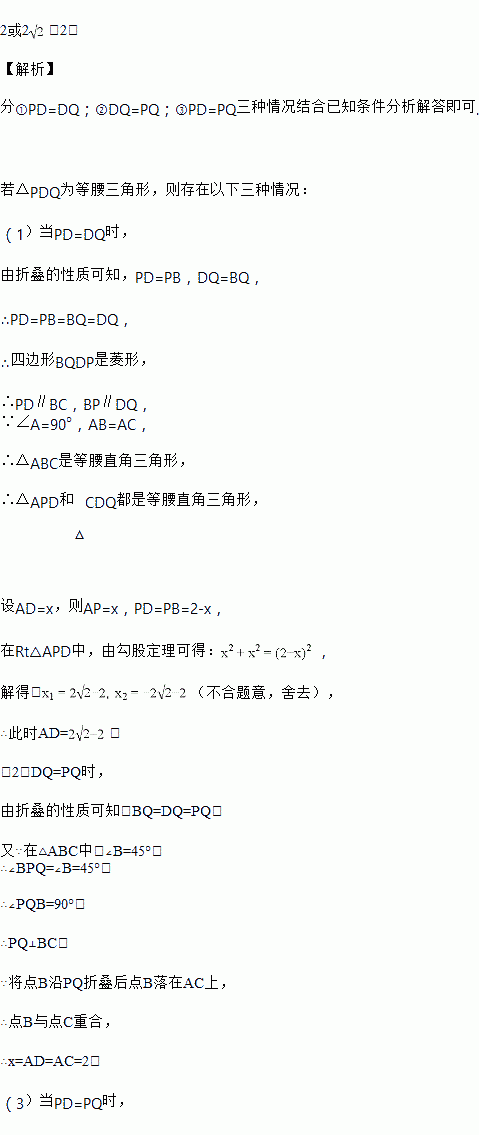 如图,在三角形ABC中,∠A=90°,AB=AC=2,将△ABC折叠,使点B落在边AC上点D (不与点A重合)处,折痕为PQ,当重叠部分△PQD为等腰三角形时,则AD的长为_____.