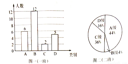 在学校组积的科学家素养竞赛中,每班参加比赛的人数相同,成绩分为A、B、C、D四个等级,其中相应等级的得分依次记为90分、80分、70 分、60 分,学校将八年级(1)班和(2) 班的成绩整理并绘制成如下的统计图:
