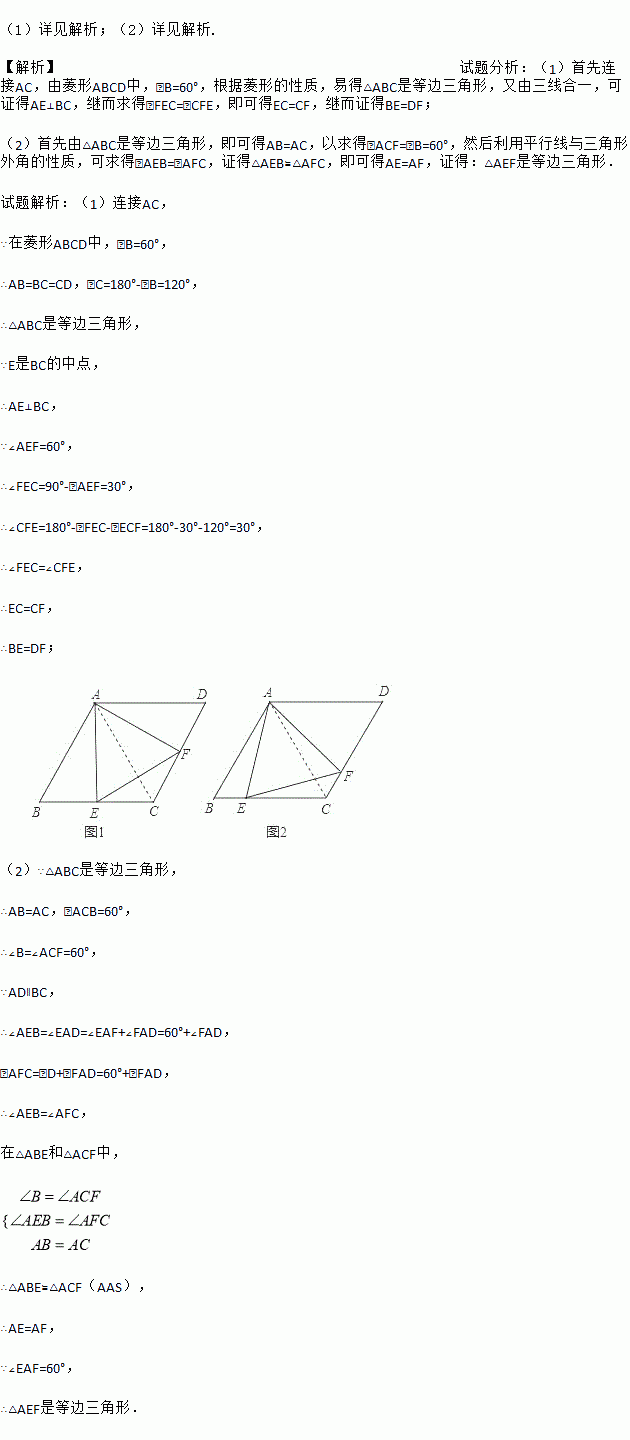 (1)如图①,若点E是BC的中点,∠AEF=60°,求证:BE=DF;