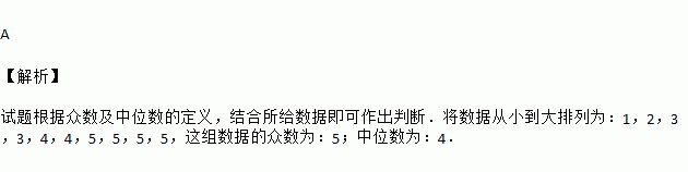 实验学校九年级一班十名同学定点投篮测试,每人投篮六次,投中的次数统计如下:5,4,3,5,5,2,5,3,4,1,则这组数据的中位数,众数分别为( )