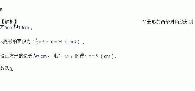 若一个菱形的两条对角线长分别是5cm和10cm,则与该菱形面积相等的正方形的边长是