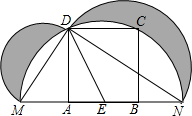 如图,在边长为6的正方形ABCD中,E是AB的中点,以E为圆心,ED为半径作半圆,交A、B所在的直线于M、N两点,分别以直径MD、ND为直径作半圆,则阴影部分面积为( )