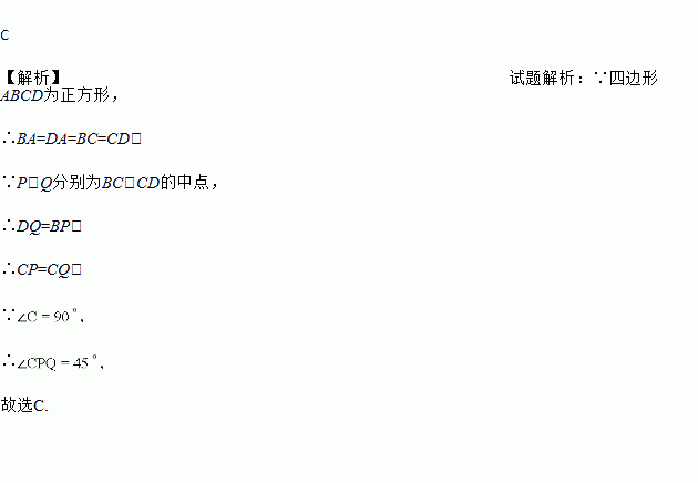 如图,在正方形ABCD中,P、Q分别为BC、CD的中点,则∠CPQ的度数为( )