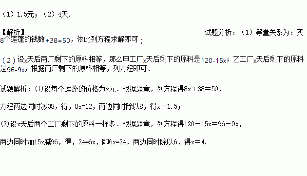 (1)李江买了8个莲蓬,付了50元钱,找回了38元钱,则每个莲蓬的价格为多少元?