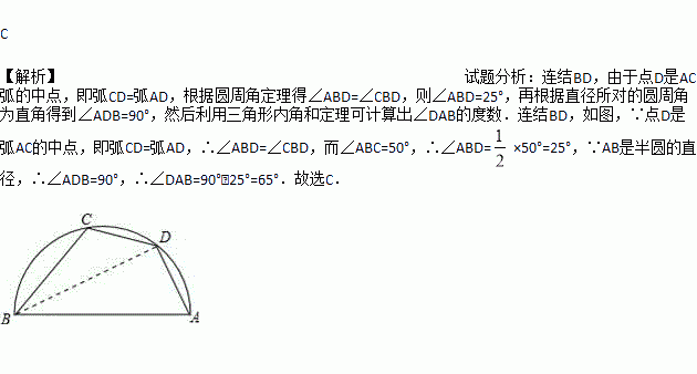 如图,AB是半圆的直径,点D是弧AC的中点,∠ABC=50°,则∠DAB等于( ).