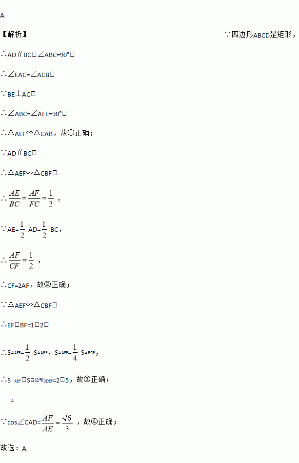 A 【解析】∵四边形ABCD是矩形, ∴AD∥BC,∠ABC=90°, ∴∠EAC=∠ACB, ∵BE⊥AC, ∴∠ABC=∠AFE=90°, ∴△AEF∽△CAB,故①正确; ∵AD∥BC, ∴△AEF∽△CBF, ∴, ∵AE=AD=BC, ∴, ∴CF=2AF,故②正确; ∵△AEF∽△CBF, ∴EF:BF...
