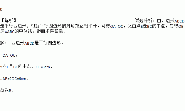 如图,□ABCD中,对角线AC、BD交于点O,点E是BC的中点.若OE=3cm,则AB的长为( )
